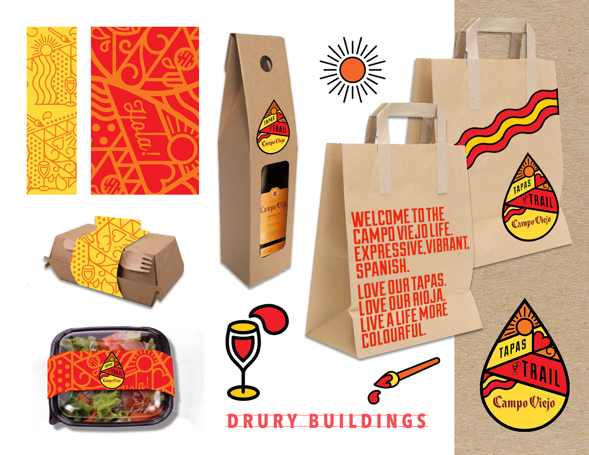 In 2017, Campo Viejo partnered with Deliveroo and participating restaurants such as Drury Buildings in Dublin. The design brief was to create a range of branded Campo Viejo packaging that could be used to package both the delivery food and wine bottles that may be ordered. Using the brand’s playful Tapas Trail design elements, I created a range of bag, boxes, wax paper, wraps and stickers to ensure all deliveries appeared fun and expressive like the brand itself.