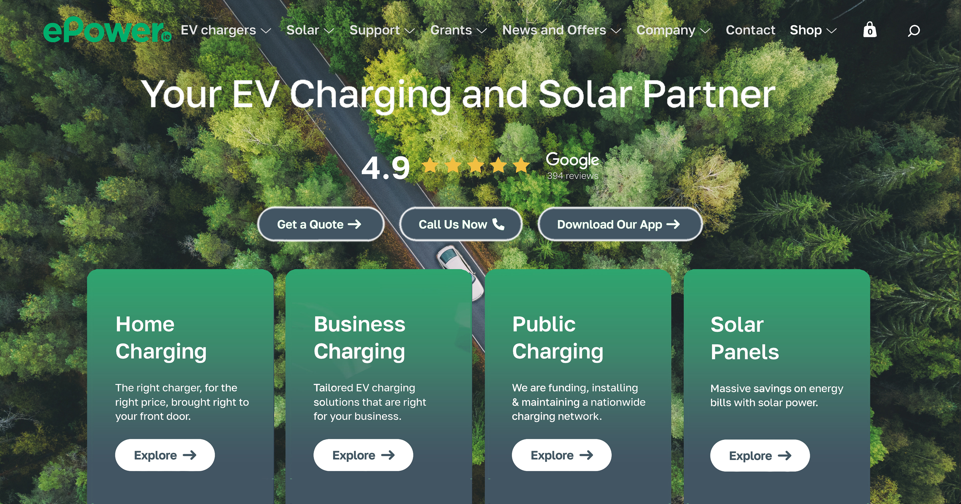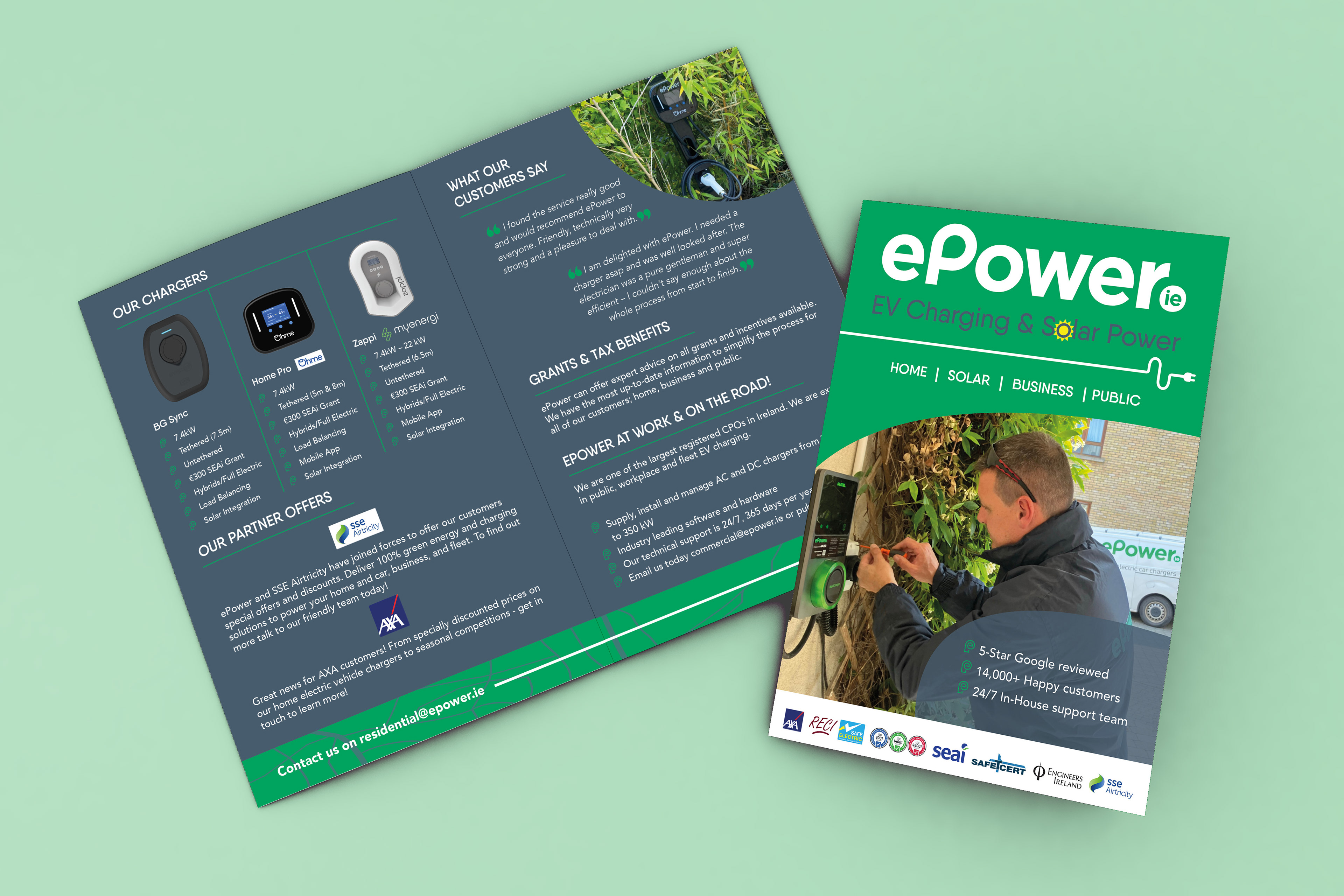 I've worked closely with ePower, specialists in EV charging and solar power solutions — supporting the ongoing evolution of their brand across both print and digital touchpoints. My work has spanned a wide range of deliverables, including marketing materials, charger wrap branding, a comprehensive suite of directional signage, website design, app assets, and large-scale exhibition displays.